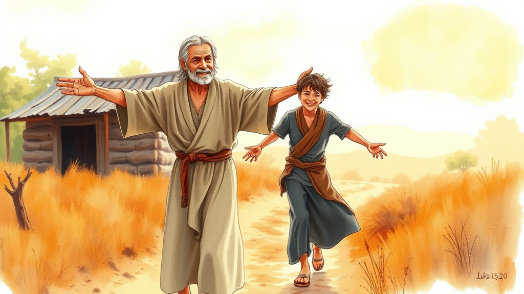 그 아들은 일어나서, 아버지에게로 갔다. 그가 아직도 먼 거리에 있는데, 그의 아버지가 그를 보고 측은히 여겨서, 달려가 그의 목을 껴안고, 입을 맞추었다.