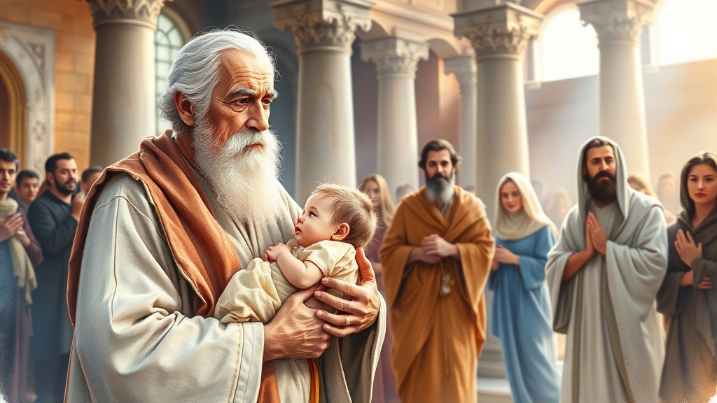시므온이 아기를 자기 팔로 받아서 안고, 하나님을 찬양하여 말하였다. "주님, 이제 주님께서는 주님의 말씀을 따라, 이 종을 세상에서 평안히 떠나가게 해주십니다. 내 눈이 주님의 구원을 보았습니다. 주님께서 이것을 모든 백성 앞에 마련하셨으니, 이는 이방 사람들에게는 계시하시는 빛이요, 주님의 백성 이스라엘에게는 영광입니다."